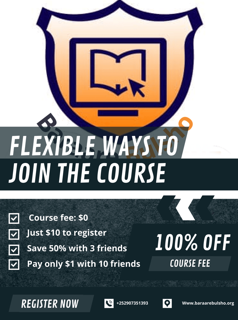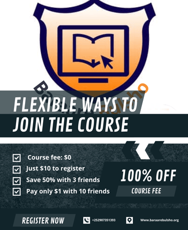 🟩 Fiiro gaar ah: Koorsadu waa bilaash, ma jiro lacag bille ah ama kharashka kale oo laga rabo. Keliya isdiwaangeli adigoo raacaya talabooyinka kor ku xusan. Wixii farsamo ah nagala soo xiriir 0907351393 ama fariin noogu reeb support@baraarebulsho.org